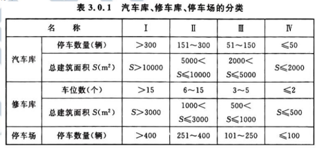 汽車庫、修車庫、停車庫類別是根據(jù)停車(車位)數(shù)量和總建筑面積確定的,分為Ⅰ類、Ⅱ類、Ⅲ類、Ⅳ類等四類。